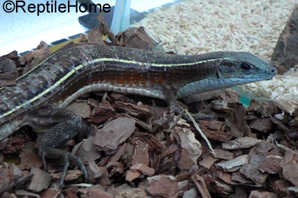 Il est de couleur brun foncé à noir, avec des bandes longitudinales claires.